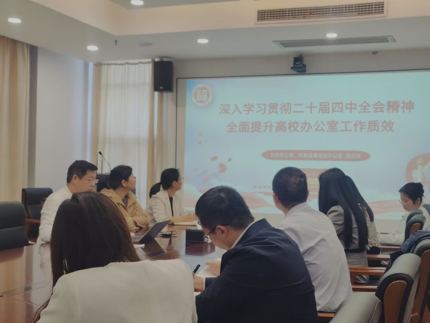 2025年11月14日,党政办公室、校友会、基金会党支部书记以“深入学习贯彻党的二十届四中全会精神,全面提升高校办公室工作质效”为题为支部党员讲授专题党课,档案馆全体党员干部参加学习。